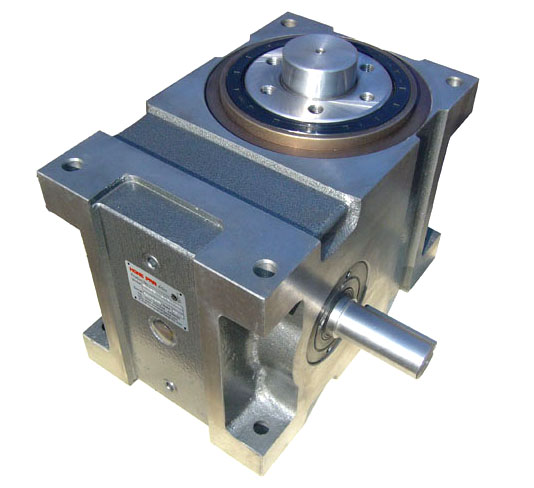 当凸轮分割器运动时,输入轴旋转,输入轴上的转位凸轮旋转,带动与之啮合的凸轮滚子,凸轮滚子与输出转台和输出轴为一体,输出转台驱动输出。轴实现分离运动。这种状态也称为分割运动状态。